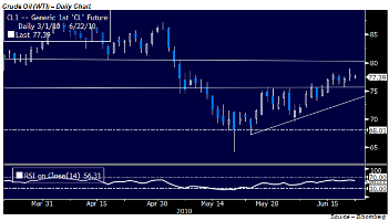 Despite a late day stock market reversal on Monday, crude oil was able to eke out yet another gain. Prices have now risen in five of the last six sessions. The bottom line right now is that crude oil has bottomed out and traders will be looking to buy dips rather than sell rallies. The move from $87 to the mid-$60’s was largely a function of fear that the world economy would experience substantial slow down, with major economies potentially falling into a second recession, a double dip. At least so far, these bearish fears have not come to fruition, thus prices naturally rise as selling pressure exhausts itself. That said, crude inventories remain high and as long as budgets are being cut across Europe, risks remain, and so a rally significantly above $80 seems unlikely. A range trade may be the scenario that is developing here. Look for support at $75.50 and resistance at $80.00.