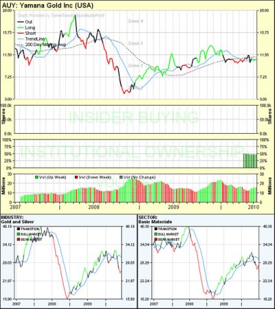 AUY trades in the top of Zone 2 (see grey area in the above chart) and as long as the broader market does not trend appreciably lower, AUY could be buoyed by the rising price of gold.